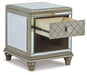 Glamorous, chic and sophisticated. This rectangular end table is made with a metallic silvertone finish, inset beveled mirror panels and drawer pulls adorned with faux crystals. No matter how you style it, this table is a stunning addition to your contemporary decor.