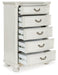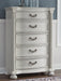 Transform your inner sanctum into a haven of timeless elegance and functionality. This traditionally styled chest of drawers is adorned in a classic antiqued white finish, highlighted by a serpentine-shaped front with thick decorative moulding. Its drawers are packed with ample storage possibilities. And did we mention the stylish reeded bun feet? Talk about relaxed refinement.